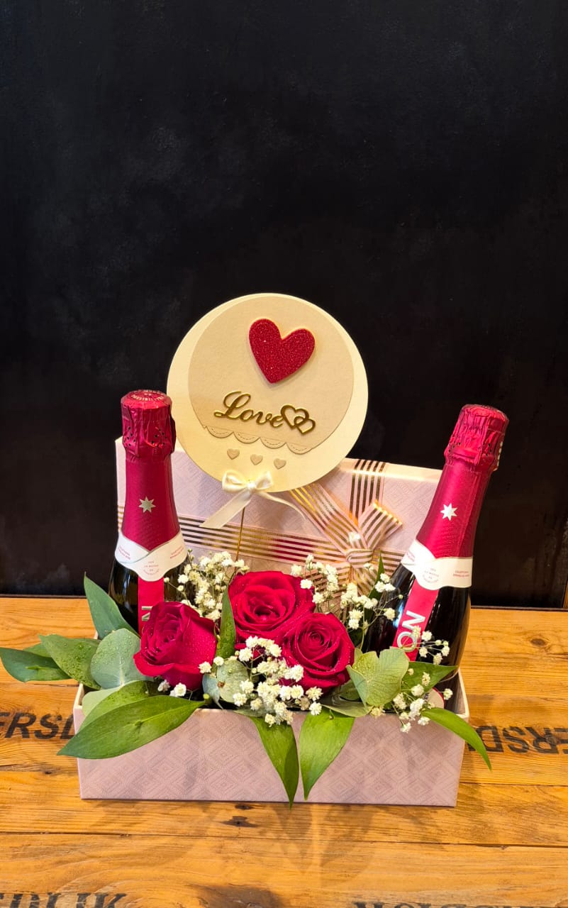 Caja con 3 rosas, 2 botellas de aperitif chandón 375 cc. y cartel Love.