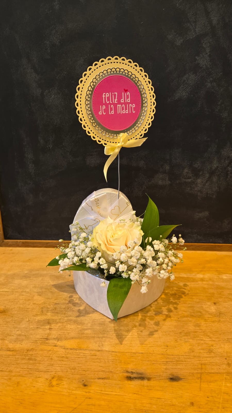 Caja corazón rosada con rosa y cartel