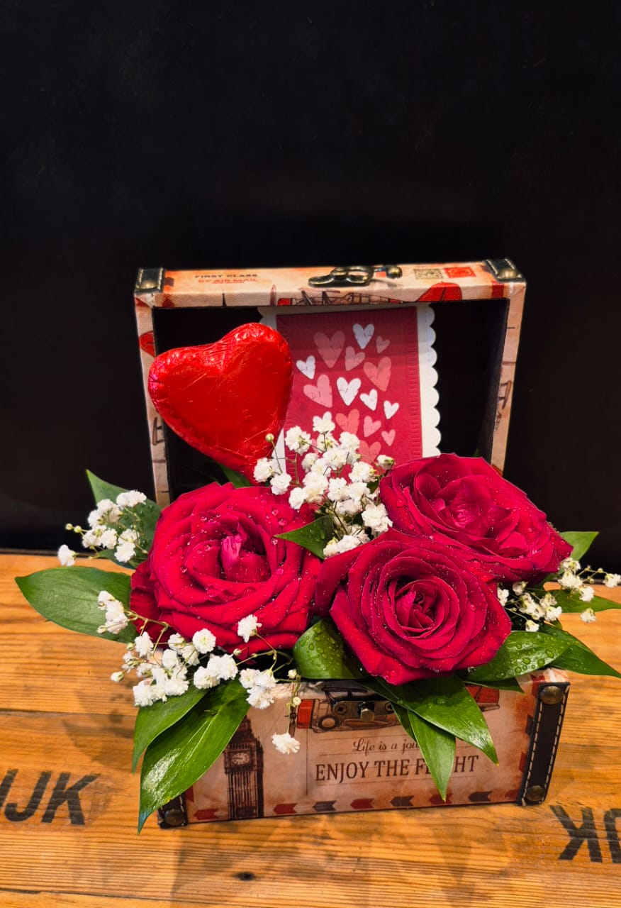Cofre con arreglo de 3 rosas rojas, tarjeta y corazón de chocolate.