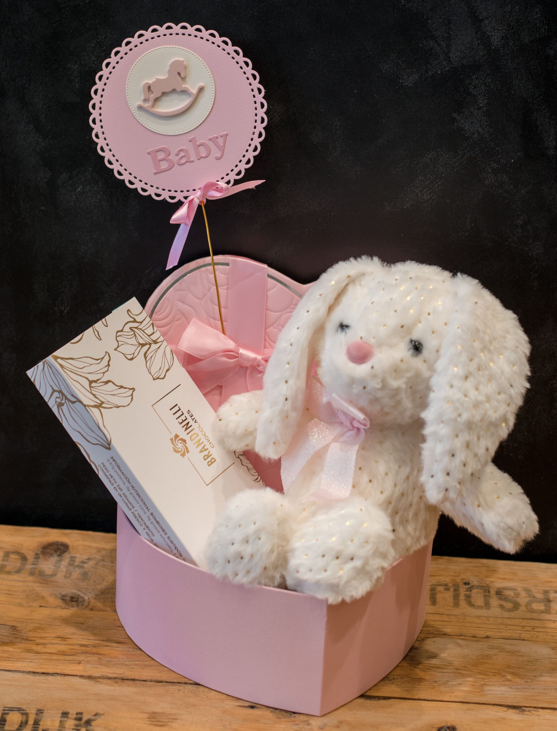 Caja corazón con conejito brillitos + bombones + cartel