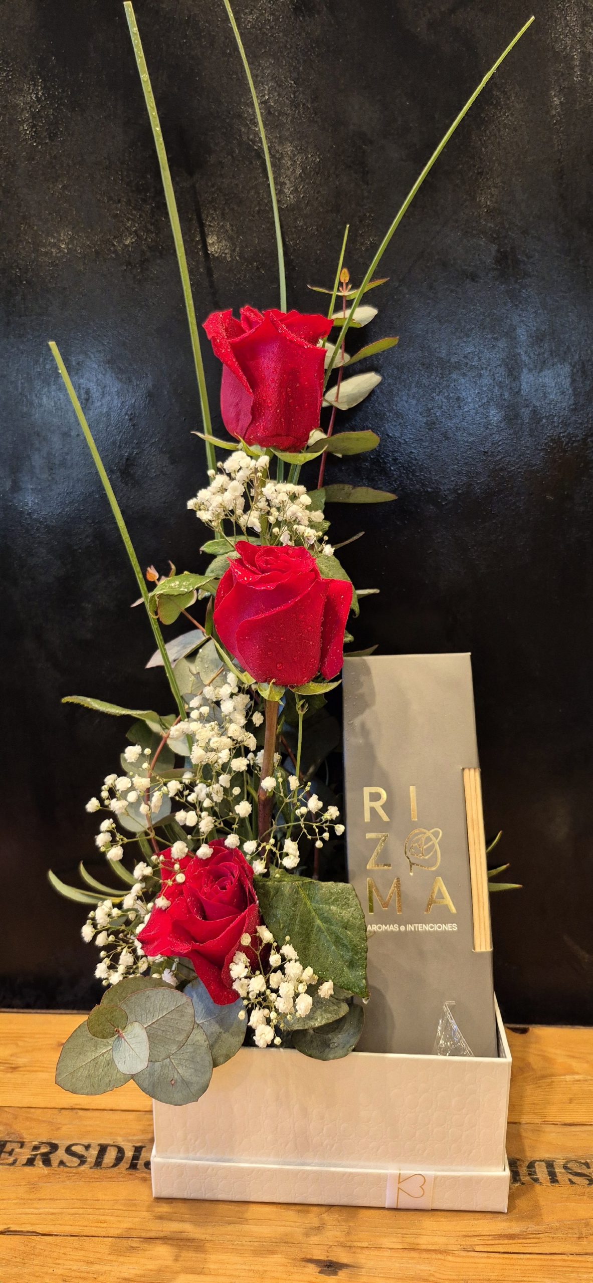 Arreglo de 3 rosas (podés pedir otros colores) + Difusor de aromas