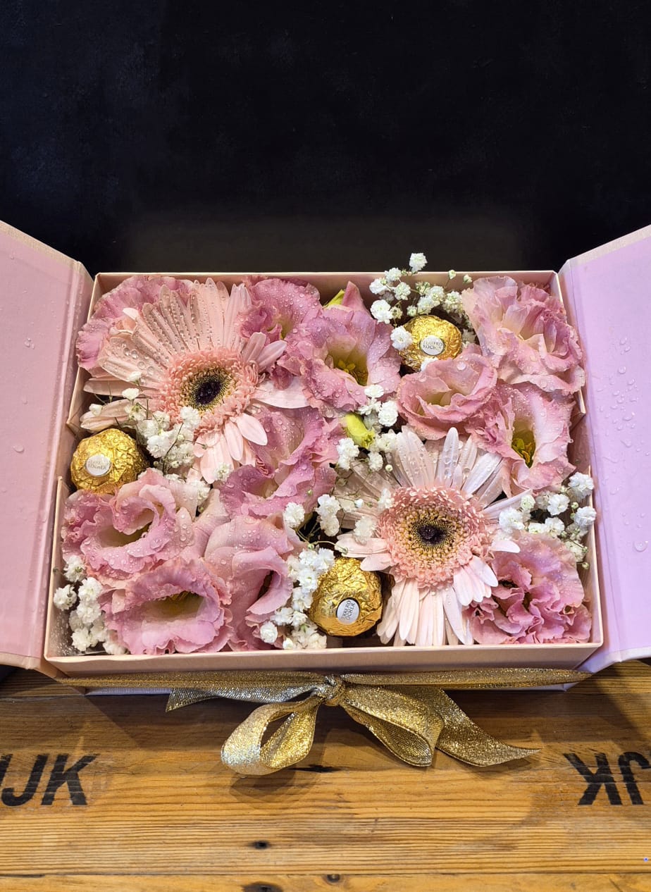 Caja con delicado arreglo de flores rosadas y 3 Ferrero Rocher