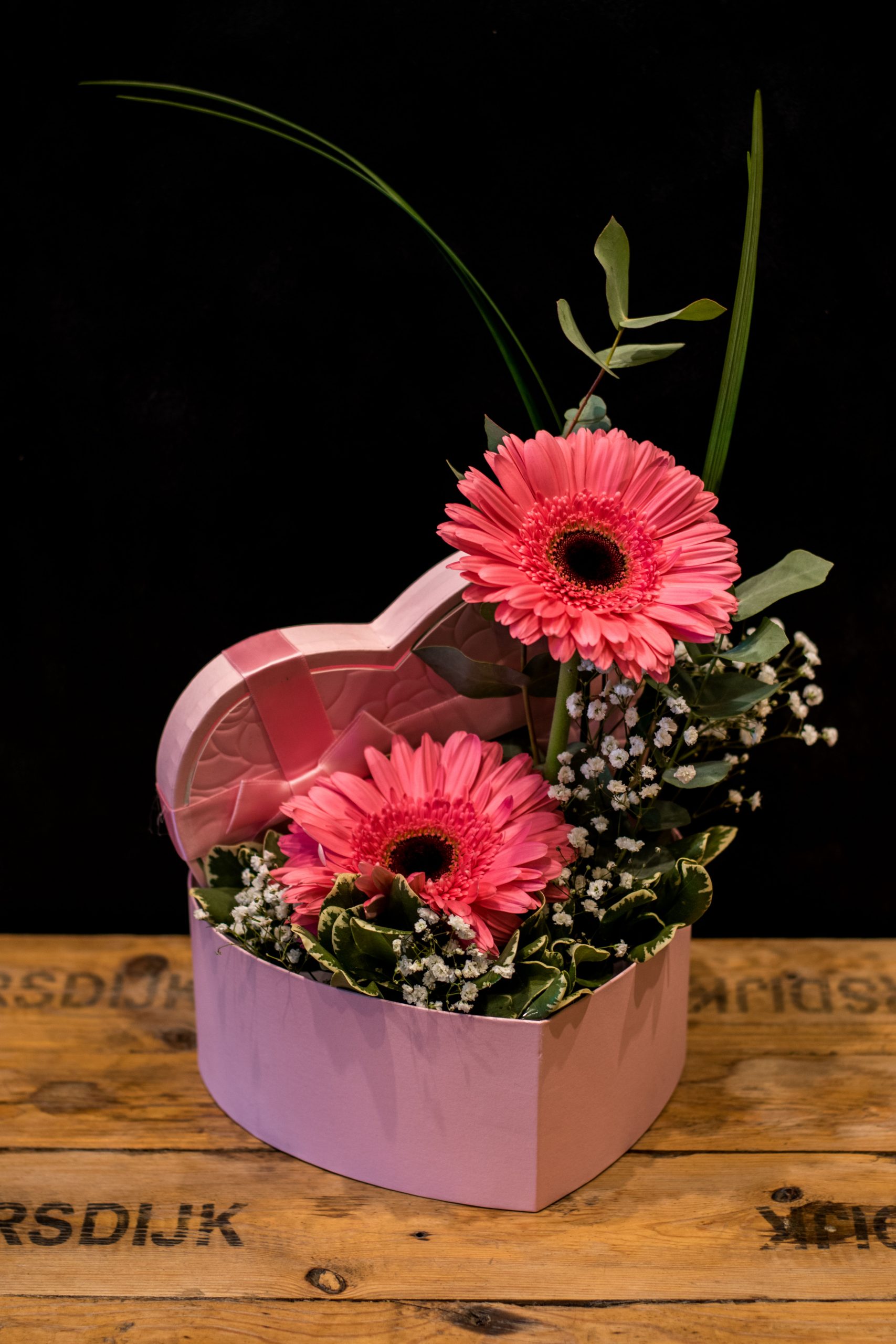 caja con forma de corazón con 2 gerberas