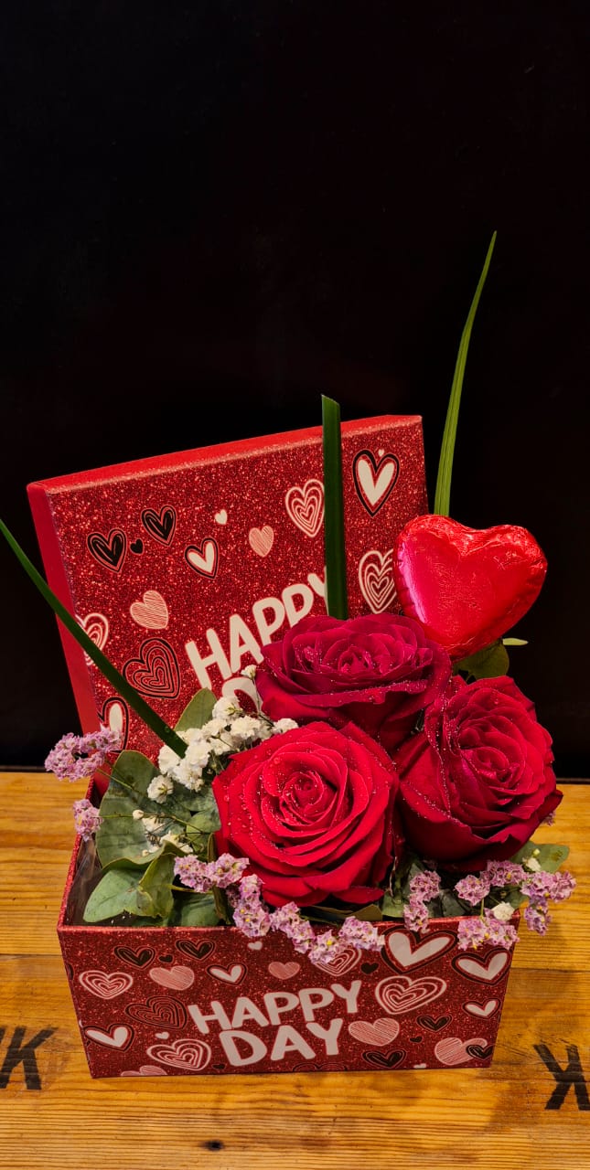 Cajita Happy Day con 3 rosas y chupetín de chocolate.