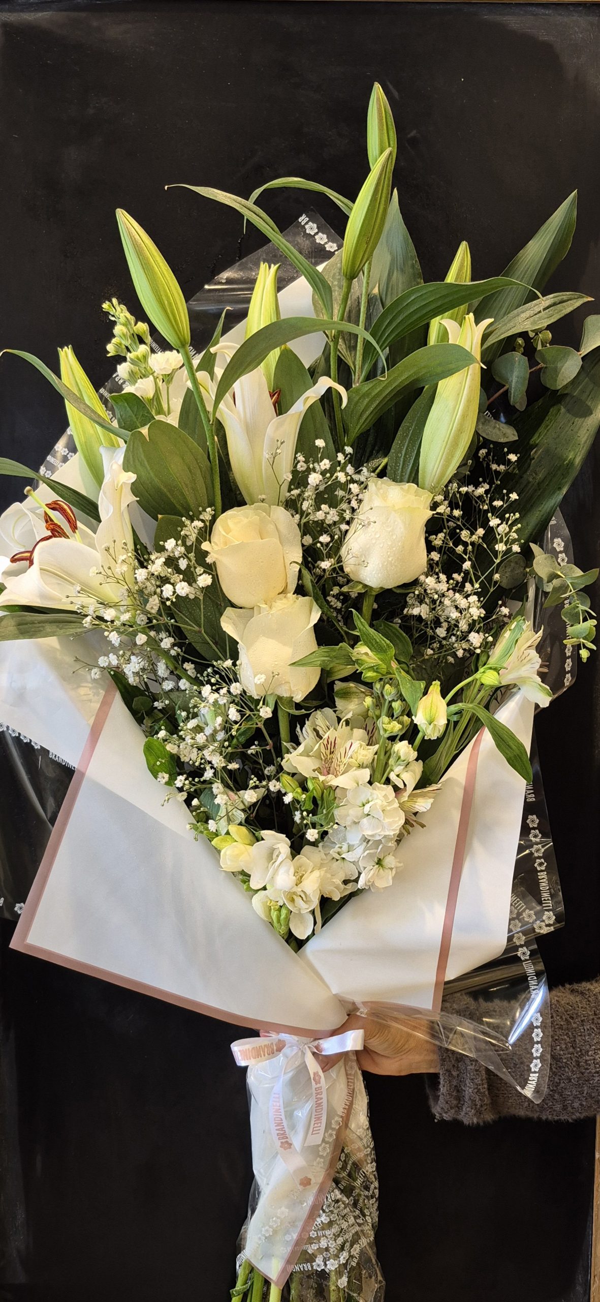Lilium perfumado, rosas y flores de estación en color blanco, una delicadeza.