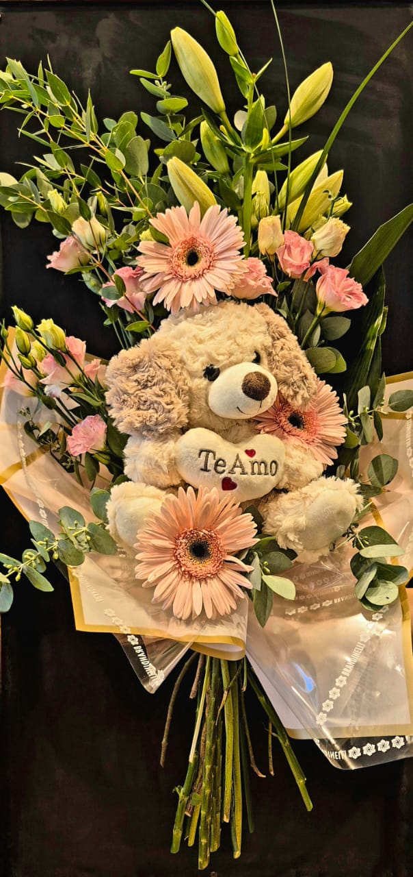 Hermoso ramo de flores rosadas con perrito con corazón