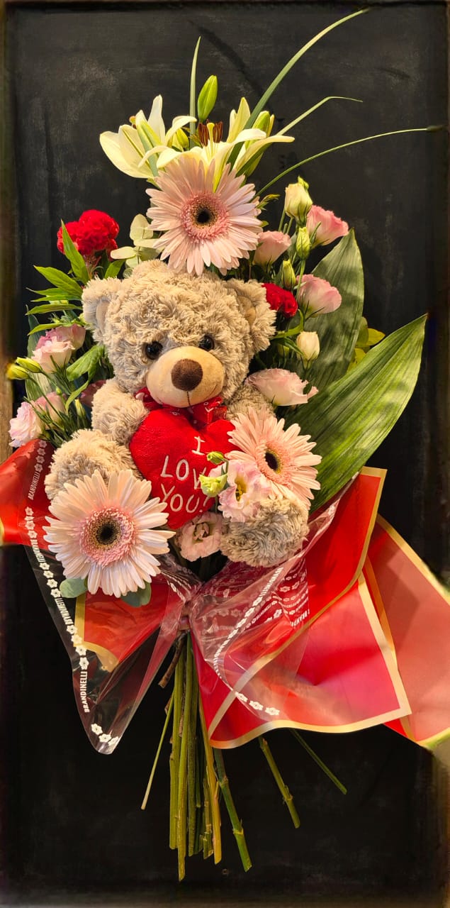 Ramo conflores vaiadas en tonos rojo y rosado (o el que nos indiques) + oso suave, muy suave con corazón.