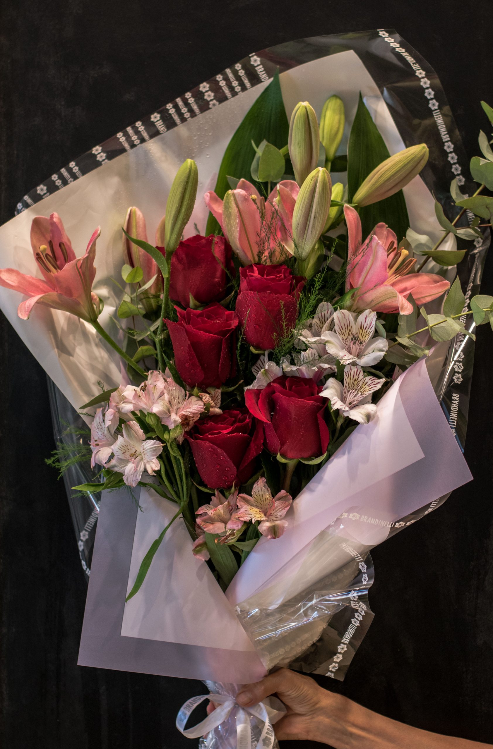 Importante ramo con lilium, rosas rojas y flores de estación. Podés indicarnos preferencias de colores por nota o por whatsapp